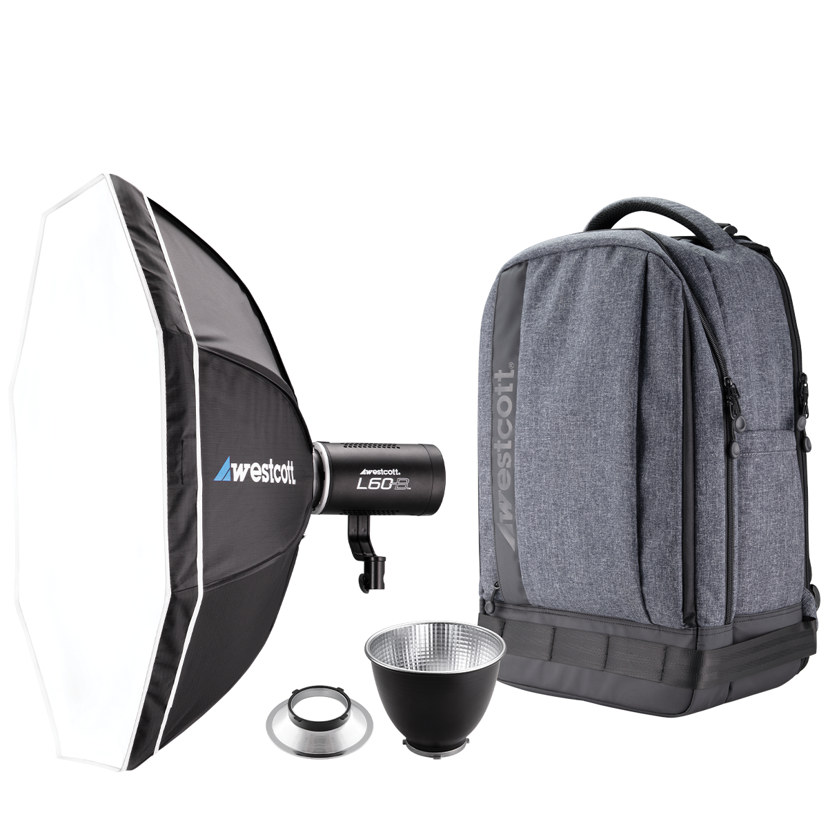 A variety of compact LED kits are available with versatile Rapid Box Switch Octa-S softboxes, batteries, and a backpack with large storage compartments for easy travel.