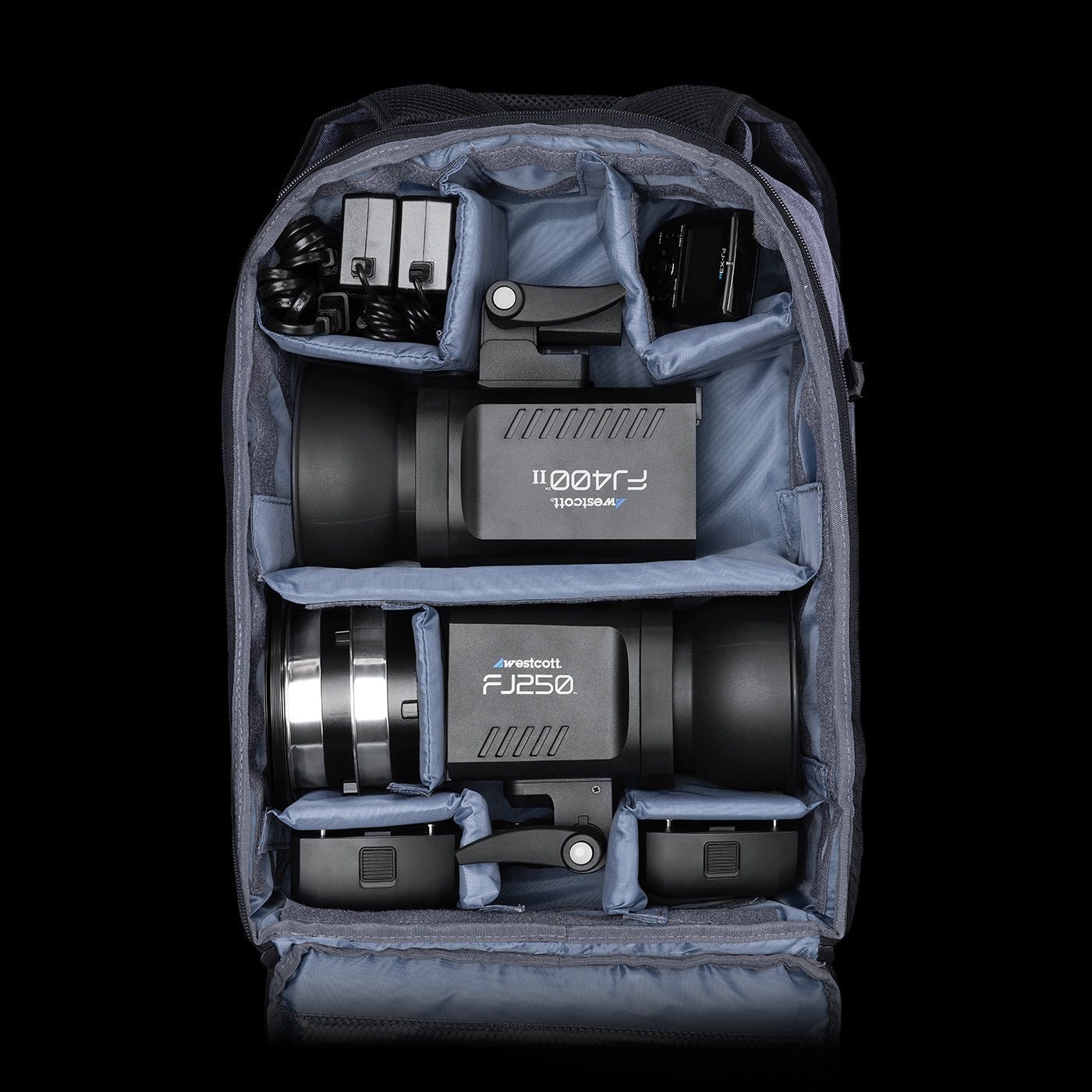 - Includes FJ400 II and FJ250 Strobes with FJ Pro AC/DC Batteries, FJ-X3 Wireless Trigger, Magnetic Gel Sets, Rapid Box Switch Inserts, Lite Traveler Backpack